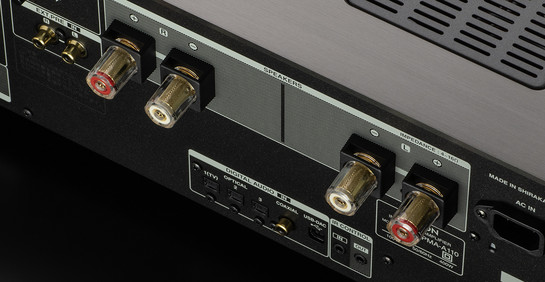 Bornele pentru boxe de pe PMA-A110 sunt placate cu aur pentru a preveni coroziunile si pentru a mentine conexiuni fiabile de lunga durata. Sunt suportate mufe spada si banana. |