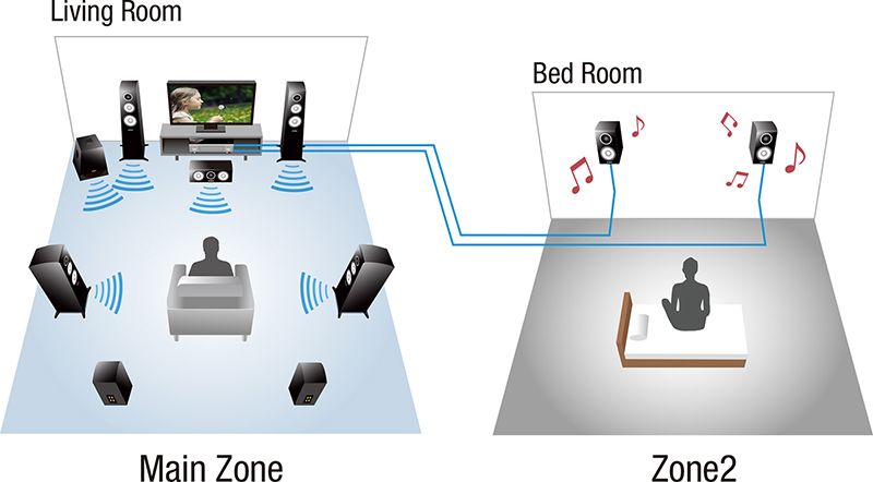 AV Receiverul ofera posibilitatea de a transmite semnale audio-video si intr-o alta camera / zona prin intermediul mufelor dedicate si al configurarii amplificatoarelor interne (prin cablurile instalate deja).