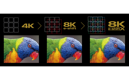 Tehnologia proprietara 8K/e-shift a beneficiat de un progres semnificativ - ce combina tehnologia de afisare de inalta rezolutie "e-shift", ce dubleaza rezolutia prin mutarea unui pixel cu 0.5 pixeli, cu dispozitivul nativ 4K D-ILA de 0.69". |